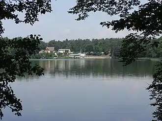 | Blick über den Großen Däbersee auf das Volksbad von 1955 | ||