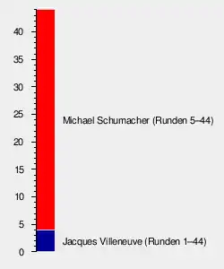 Michael Schumacher konnte seine Führung konstant ausbauen, und so führte er ab Runde zwölf eine ganze Minute vor dem Zweiten. Villeneuve hingegen wurde aufgrund zweier unplanmäßiger Boxenstopps bis auf Platz 16 zurückgereicht.