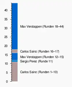 Nachdem Verstappen in Runde 15 zum Reifenwechsel (Soft auf Medium) gekommen war, verlor er die Führung wieder an Sainz jr. Sein Rückstand betrug 5,0 Sekunden, bei 1,4 Sekunden Vorsprung auf Pérez. Innerhalb einer Runde konnte Verstappen den Rückstand dank frischerer Reifen wieder bis auf 1,9 Sekunden verkürzen und ging in Runde 18 erneut in Führung.