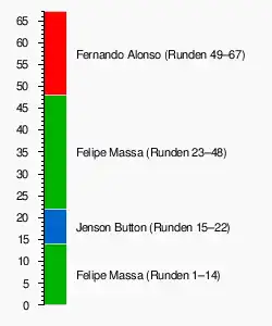 Während Massa mit den weichen Reifen, die er am Start gefahren war, schneller als Alonso war, konnte er sich mit den harten Reifen nicht mehr von Alonso absetzen. Alonso versuchte am Brasilianer vorbeizukommen, schaffte es aber nie vorbei. Nachdem Button an der Box gewesen war, gingen die beiden Ferrari erneut in Führung. Nachdem Alonso am Boxenfunk äußerte, dass er die Situation lächerlich finde, vergrößerte sich der Abstand zwischen den beiden Piloten auf mehrere Sekunden. Nachdem einige Sekunden Abstand zwischen den beiden lagen, gelang es Alonso erneut den Abstand zu verringern. Nach 48 Runden teilte Massas Renningenieur ihm mit, dass Fernando schneller als er sei und fragte ihn ob er diese Botschaft verstanden habe. Eine Runde später nach der Haarnadel ging Massa vom Gas und Alonso zog an ihm vorbei.