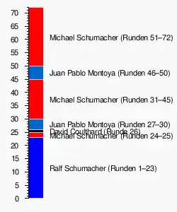 Nachdem auch Michael Schumacher ein paar Runden später seinen zweiten Boxenstopp absolviert hatte, führte Montoya kurzzeitig. Nach dessen Boxenstopp fiel er jedoch wieder hinter Ralf zurück.