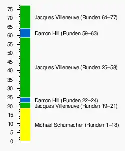 Als Hill in der folgenden Runde an die Box ging, übernahm wieder Villeneuve die Führung und gab sie bis Runde 59 nicht mehr ab. Nachdem Hill sich noch ein weiteres Mal an die Spitze setzte, übernahm Villeneuve ein letztes Mal die Führung und gab sie bis ins Ziel nicht mehr ab. Hill wurde Zweiter, Dritter wurde Benetton-Pilot Alesi.[5] Für Villeneuve war es der dritte Sieg der Saison und seiner Karriere.