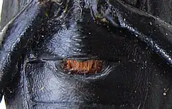 Der Kopf ist breit, aber deutlich schmaler als Halsschild und Flügeldecken. Er ist hinter den Augen eingeschnürt. Wie bei allen Schwarzkäfern ist die Einlenkung der Fühler am Kopf von oben nicht sichtbar, weil sie von den randförmigen Erweiterungen der Wangen überdeckt ist. Diese Verbreiterung des Kopfrandes engt die schmalen Facettenaugen, die sich von der Kopfoberseite bis zur Kopfunterseite ziehen, vorn leicht ein. Die Fühler sind schnurförmig und elfgliedrig, das dritte Fühlerglied ist über doppelt so lang wie die folgenden. Die letzten vier Fühlerglieder sind rundlich und matt, die vorhergehenden vier länger, mattglänzend und trapezförmig.