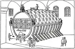 Ein Problem war es, das nötige Bauholz für Dauben, Bodenplatten und Gerüst zu besorgen. Wegen der hohen Anforderungen an das Eichenholz für die Dauben, der starken Nutzung der Wälder für Viehmast oder Brenn- und Bauholzquelle und der teilweise komplizierten Besitzverhältnisse musste das Holz aus verschiedenen Gemeinden der Kurpfalz beschafft werden. Die Fällarbeiten und der Transport zum Schloss wurden als Fronarbeiten ausgeführt.[2] Anschließend mussten die Dauben noch längere Zeit trocknen. Über den weiteren Bau bis 1663 ist nichts bekannt. Im Frühling 1663 wurde der Abriss des alten Fasses bewilligt. Im Oktober wurde das neue Fass ausgebrannt. Es fiel jedoch auf, dass noch zwei Bodenbretter fehlten. Da kein geeignetes trockenes Holz vorhanden war, wurde der Bauprozess dadurch noch weiter verzögert. Erst im April 1665 waren die Arbeiten am Fass selbst beendet, es folgten noch Arbeiten an der steinernen Unterlage und die Eichung. Im vier Tage dauernden Eichprozess unter Anwesenheit der beiden Heidelberger Bürgermeister, eines Vertreters der Rechenkammer und zweier Küfermeister als geschworene Fasseicher wurde die Füllkapazität auf 204 Fuder, 3 Ohm und 4 Viertel bestimmt. Sie überschritt das ursprünglich geforderte Volumen von 160 Fudern erheblich.[3]