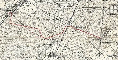- ↑ Kristof Doffing: Nahkampfmitteldepot Kelsterbach 1925. Stadtarchiv Langen, 25. März 2022, abgerufen am 25. Mai 2022 (Ausschnitt mit der Waldbahn vor 1918 (rot), nach 1918 (cyan) sowie dem „Nahkampfmitteldepot Kelsterbach“ mit Sprengplatz (blau)).