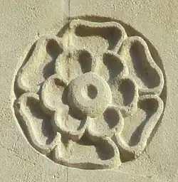 Die vier Blüten in der Mitte der Quadratplatte zeigen Rosen mit acht inneren und acht äußeren Kronblättern. Diese Art der Rosendarstellung ist aus der Heraldik bekannt. Die Mitte mit den Staubblättern ist ein einfacher Knopf, wie bei den Fensterrosetten in Kirchen und in der Heraldik. Das Wappen von Osterwieck, ein Ort in der Heimat des Grafen Mansfeld, zeigt sehr ähnliche Kronblätter, jedoch nur fünfzählig. Doch am alten Rathaus der Stadt Luxemburg sind acht Blütenblätter anstatt fünf gezeigt, weshalb die Symbolik weniger in der Botanik der Hecken-Rose, als in der Heraldik und Politik zu suchen ist. Martin Luther, der in der Grafschaft Mansfeld, der Heimat des Bauherrn des Luxemburger alten Rathauses, geboren wurde und den Protestantismus von dort aus verbreitete, führte als Wappen die fünfblättrige „Lutherrose“. Graf Peter Ernst I. von Mansfeld diente jedoch den katholischen Spanischen Niederlanden und wollte mit den acht heraldischen Kronblättern jede Verwechslung mit der fünfblättrigen Tudor-Rose der Engländer oder mit der Rose des Reformers Martin Luther ausschließen. Viele Fensterrosen in katholischen Kirchen sind durch vier teilbar mit acht, sechzehn, zwanzig und vierundzwanzig Rosettenfächern.