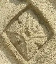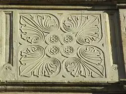 Die quadratische vierblättrige Platte über dem Balkon zeigt eine frühe Akanthusrosette, deren Mitte aus vier achtblättrigen Rosenblüten gebildet wird. Die großen Pik-förmigen Schaufeln gehen noch auf gotische Quadrate zurück, deren Ecken traditionell mit vier Schwertlilien oder heraldischen Lilien gefüllt waren. Die Renaissance bevorzugte jedoch die Akanthusblätter aus der Antike als herrschaftliches Symbol, so dass man am alten Rathaus von Luxemburg die Quadratplatte als Motiv der Frührenaissance bezeichnen kann.