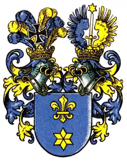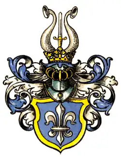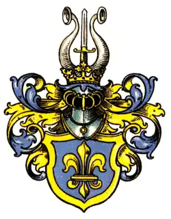 - Das Wappen von 1741 zeigt innerhalb eines goldenen Schildrandes in Blau eine goldene Lilie. Auf dem Helm mit blau-silbernen (auch blau-goldenen) Decken ein aufgerichtetes goldbegrifftes blankes Schwert zwischen zwei silbernen Büffelhörnern.