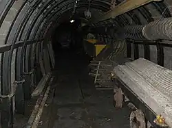 - Der nachgiebige Ausbau (z. B. Gleitbogenausbau) weicht Belastungen aus dem Gebirge durch Ineinanderschieben der Ausbauelemente aus und vermeidet dadurch hohe Spannungen auf dem Ausbaumaterial.[1] Der Nachteil liegt in der Querschnittseinengung, die bis zum Verlust der Befahrbarkeit der Strecke führen kann.