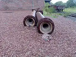 - Bei Steinkohlenbergwerken enthält das Grubenwasser neben 4–6 Prozent Kochsalz auch Anteile von Nickelsulfat, Eisenoxide und Mangan.[5] Der Salzgehalt im Grubenwasser beträgt bei einigen Bergwerken bis zu 20 Prozent.[11] Eisen fällt in sauerstoffreichem Wasser in Form von Eisen(III)-oxidhydraten („Eisenocker“) aus, welche einen charakteristischen rotbraunen Niederschlag bilden. Je nach Gebirgsschicht kann das Grubenwasser entweder sulfathaltig oder chloridhaltig sein. Werden diese Grubenwässer miteinander vermischt, kommt es zur Ausfällung von Bariumsulfat. Bei dieser Ausfällung wird das in den Wässern enthaltene Radium mitgefällt.[17]