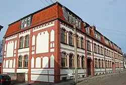 Nach dem ersten Entwurf war beabsichtigt über den vier westlichen Fensterachsen einen neogotischen Staffelgiebel zu errichten. Ob dieser je ausgeführt wurde, ist nicht bekannt, zumindest wäre er dann jedoch in der zweiten Bauphase ab 1910 wieder entfernt worden. In dieser Phase entstand der heutige Mittelteil bis hinter den östlichen Eingang.