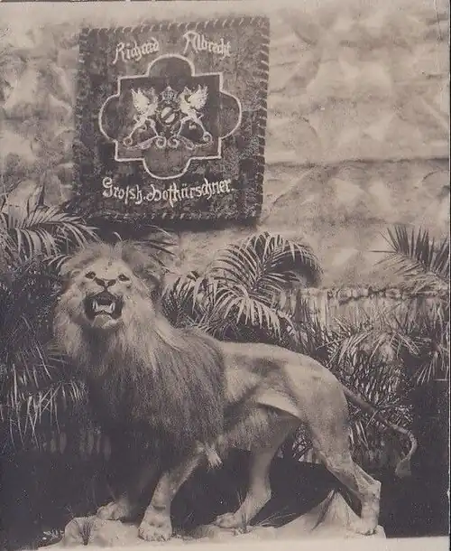 Ausgestopfter Löwe, Meisterstück eines Kürschners, als Rückwand eine Guanakodecke (1913)