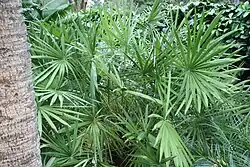 Die Blätter sind reduplicat, fächerförmig und vertrocknen an der Pflanze (Marzeszenz). Die Blattscheiden zerfallen in eine Masse von verwobenen, groben, schwarzen, stachelartigen Fasern oder in ein zungenförmiges Netz von groben, flachen Fasern. Der Blattstiel ist mäßig lang, unbewehrt, mit scharfen Rändern und wollig behaart. Die Hastula auf der Oberseite ist rundlich, kahl oder mit wolligem Haar besetzt. Die Blattspreite ist kreisrund oder keilförmig. Sie ist auf 3/4 bis 4/5 des Radius geteilt in rund 20 linealische, einfach oder selten doppelt reduplicat gefaltete Segmente. Die Ränder der Segmente sind gezähnt oder glatt. Die Oberseite der Spreite ist dunkelgrün und kahl mit Ausnahme von Schuppen entlang der Blattrippen. Die Unterseite ist dicht mit silbernen wolligen Haaren besetzt oder auch kahl.