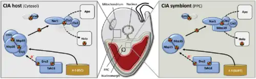Vergleich des cytosolischen Zusammen­baus von Eisen-Schwefel-Proteinen (en. iron-sulfur protein assembly, CIA) im (Wirts-)Zytoplasma und im Periplastidraum (PPC, Sym­bionten-Zytoplasma) bei G. theta