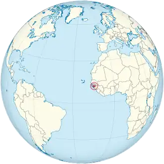Guinea-Bissau liegt im Westen von Westafrika und Oberguinea zwischen 13° und 17° westlicher Länge und 11° und 12° nördlicher Breite. Im Norden grenzt die Republik an Senegal (gemeinsame Grenze rund 338 km), im Osten an Guinea (gemeinsame Grenze rund 386 km), die gesamte Grenzlänge beträgt 724 Kilometer zuzüglich 350 Kilometer Küste. Mit einer Gesamtfläche von 36.125 km² (28.120 km² Landfläche und 8005 km² Wasserfläche) ist das Land rund zehn Prozent kleiner als die Schweiz[5] oder etwa so groß wie Baden-Württemberg.