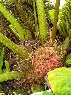 Die Art kommt häufig auf Rohböden mit geringem Stickstoffgehalt vor. Möglich ist dies durch die Symbiose mit einem Luftstickstoff-fixierenden Cyanobakterium, Nostoc punctiforme. Nostoc wird über spezielle rot gefärbte Drüsen als vom Wind verbreitete Dauerzelle (Akinete)[8] schon von der Keimpflanze aufgenommen. Sie besiedeln das Rhizom, wo sie angereichert in becherförmigen Fortsätzen mit besonders viel Stomata vorkommen. Die Symbiose von Gunnera und Nostoc ist die einzige eines Cyanobakteriums mit einem Bedecktsamer.[9]