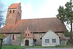 Die alte Pfarrkirche[19][20] – sie wird auch heute noch „Kirche Neuhausen“ (russisch: Кирха Нойхаузен) genannt – aus dem Ende des 13. Jahrhunderts ist ein chorloser Feldsteinbau mit Backsteinturm. Sie liegt östlich der Fernstraße A 190 und war mehr als 400 Jahre evangelische Gottesdienststätte. Im Zweiten Weltkrieg wurde sie beschädigt. Sie diente dann als Club und als Lagerhalle und verfiel dabei immer mehr, auch aufgrund mehrerer Brände.