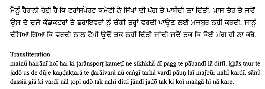 Ich war verwundert, dass das Transport-Komitee den Turban der Sikhs verboten hat, insbesondere wenn es seine anderen Schaffner und Fahrer nicht zwingt, ihre Uniform ordnungsgemäß zu tragen. Man sagte uns, dass die Mütze nicht mit der Uniform ausgehändigt wird, wenn jemand nicht ausdrücklich danach fragt.