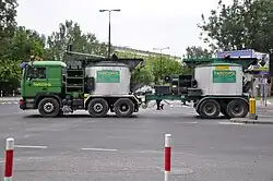- Für größere Baustellen, die nicht von LKW befahren werden können, zum Beispiel Tiefgaragen oder schmale Radwege, wurden spezielle Vorderkipper (Dumper) entwickelt.[7] Dies sind kleine, sehr wendige, auch auf engstem Raum fahrbare Gussasphaltkocher mit kurzem Radstand; sie können bis zu 600 Liter transportieren.
