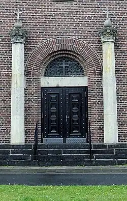 Das Portal wird von zwei freistehenden Säulen gerahmt, die mit ihren Bekrönungen an geschmückte Torarollen erinnern.