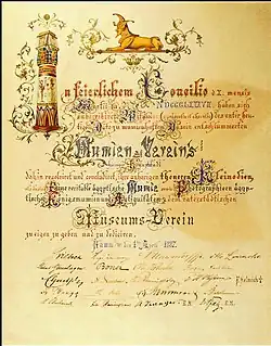 Im Frühjahr 1886 gründeten Hammer Bürger den Mumienverein.[1] Dem voraus ging die Entdeckung eines Notgrabes im ägyptischen Deir el-Bahari mit über 50 Mumien von Pharaonen, Angehörigen der königlichen Familien und hohen Würdenträgern als Weltsensation um die Welt. Ägyptenbegeistert knüpfte man Kontakte zu dem Ägyptologen Heinrich Brugsch,[2] dessen Bruder Emil als Mitarbeiter des Ägyptischen Museums in Kairo die Sicherungskampagne der sogenannten Cachette geleitet hatte.[3][4] Nach einem einschlagenden Vortrag Brugschs am 22. Februar 1886 in Hamm fasste man den Plan, eine altägyptische Mumie für Hamm zu erwerben. Dafür gründete man den Mumienverein und sammelte Gelder durch Aktien. Noch im selben Jahr konnte über Vermittlung Emil Brugschs in Kairo eine Mumie, die sicher nicht aus der Cachette stammt, sondern aus der 22./23. Dynastie, erworben und nach Hamm transferiert werden.[1] Zudem erwarb der Mumienverein ein Fotoalbum mit Abbildungen der Königsmumien aus der Cachette, die heute eine wichtige Quelle für die Ägyptologie sind, da sie den Zustand der Mumien in verschiedenen Stadien des Auswickelns dokumentieren. Der Mumienverein löste sich 1887 plangemäß selbst auf und schenkte die Hammer Mumie sowie das Fotoalbum dem im Dezember 1886 gegründeten Museumsverein. Zunächst wurde diese Hammer Mumie im Gesellschaftssaal einer Gaststätte gezeigt, danach als Eigentum des Museumsvereins Hamm im Rathaus.