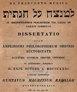 • 1831 De praecepto musico למנצח על הגתית (la-menaṣṣēaḥ ʿal hag-gittît) in inscriptionibus psalmorum VIII.LXXXI et LXXXIV conspicuo dissertatio. Dissertation OCLC 682374016