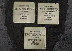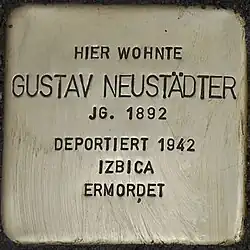 Am 24. April 1942 wurde Gustav Neustädter mit Ehefrau Paula und dem jüngsten Sohn Ernst ins Ghetto Izbica bei Lublin deportiert.[6] Wie und wann er dort oder in einem der nahen Vernichtungslager zu Tode kam, ist nicht zu ermitteln. Gustav Neustädter, Ehefrau Paula und Sohn Ernst wurden nach Ende des Zweiten Weltkriegs laut Beschluss des Amtsgerichts Bad Kissingen für tot erklärt. Als Todestag gilt der 31. Dezember 1945.