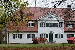 Der breitgelagerte, erdgeschossige Bau mit Mansarddach und wenig vorkragenden Zwerchhäusern wurde nach Plänen von Franz Zell errichtet. Der Baustil lehnt sich an klassizistische Gutshäuser an.
