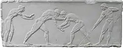 Diese fünf Übungen fasste man zusammen unter dem Namen des Pentathlon; dieselben fanden für die Knaben in der Palästra statt, als Bahn für das Laufen diente der Dromos; Jünglinge und Männer besuchten das Palästra und Dromos vereinigende Gymnasium.
