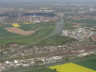 Vorne unten: Werft- und Yachthafen Lohnde Bildmitte: Chemielände Honeywell Vorne unten: Werft- und Yachthafen Lohnde Bildmitte: Chemielände Honeywell | |||