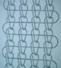 Das Gewirk entsteht so, dass ein Schussfaden in geschlossene Fransen aus Kettfäden in folgenden Schritten eingeflochten wird: