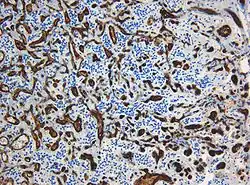 - ↑ T. J. Hufnagel u. a.: Immunohistochemistry of capillary hemangioblastoma. Immunoperoxidase-labeled antibody staining resolves the differential diagnosis with metastatic renal cell carcinoma, but does not explain the histogenesis of the capillary hemangioblastoma. In: The American Journal of Surgical Pathology. 1989;13(3), S. 207–216. PMID 2465700
