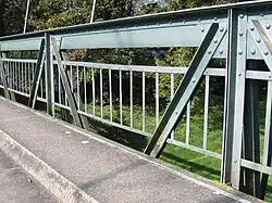 Der Brückenüberbau mit 72 Meter Stützweite ist über die Tragseile an Hängestäben aus Rundstahl aufgehängt. Die Rundstäbe haben einen Durchmesser von 40 mm und sind über Konsolen an den Fachwerkpfosten der Hauptträger befestigt. Seile und Stäbe wurden, um die Brücke in Querrichtung auszusteifen, in eine unter 1:6 geneigte Ebene gelegt.