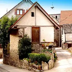 Der Hórreo in Fachwerkbauweise ist ein schlichter, verputzter Bau mit Satteldach.