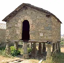 Der Hórreo aus Bruchsteinmauerwerk mit Eckquaderung steht auf zwölf Stützen. Der rundbogige Eingang, der nur mit einer Leiter erreicht werden kann, ist mit Hausteinen gerahmt. Das Satteldach ist mit Steinplatten gedeckt.