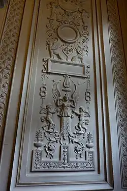 Im Innern des Mitteltraktes sind Dekorationen im Stil Ludwig XVI. erhalten: Wandreliefs, Holzvertäfelungen und der Boden aus verschieden farbigem Marmor.