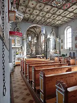 St. Bartholomäus entstand im Stil der Spätrenaissance als Saalkirche mit Rechteckchor. Der stattliche Bau ist mit großen Rundbogen- und kleineren ellipsenförmigen Fenstern ausgestattet. Die Kirche verfügt über keinen Turm, sondern über einen mehrstufigen Dachreiter mit Zwiebeldächern.[8]