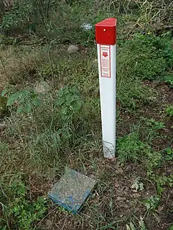 Messpunkt 32040 des Brandenburgischen Netzes aus Stein, daneben Markierungspfosten aus weißem Kunststoff mit roter Kappe