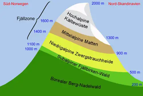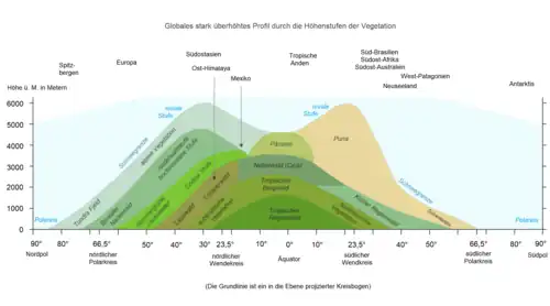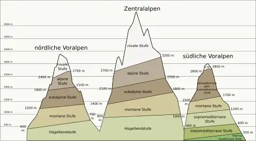 Etabliert hat sich die „klassische“ Höhenstufengliederung der (nördlichen) Alpen beziehungsweise der mitteleuropäischer Gebirge, die hier von den orographischen beziehungsweise geomorphologischen Verhältnissen (Ebene, Hügel-, Mittelgebirgs-, Hochgebirgsstufe) abgeleitet werden kann. Die Bezeichnungen stammen aus der traditionellen Alpenforschung.[12] Um den deutlich anderen Höhenzonen von Gebirgen etwa mediterraner, arider (waldfreier) oder tropischer Klimate gerecht zu werden,[2]wie auch in fremdsprachiger Literatur, finden sich teils völlig andere Bezeichnungen und Abfolgen.[1] Während dies vor allem für subtropische Gebirge gilt, werden für tropische Gebirge (vorwiegend von europäischen Autoren) zum Teil die orographischen Begriffe mit entsprechend angepassten Definitionen verwendet.[2]