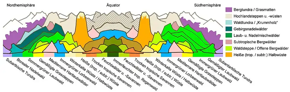 Die Abfolge und Ausprägung der Pflanzendecke von der Ebene bis zu den Gipfelregionen weist auf den ersten Blick große Ähnlichkeiten mit den globalen Vegetationszonen auf, deren Klima von der geographischen Breite vom Äquator zu den Polen abhängig ist. Diese zonalen Vegetationstypen sind auf globaler Maßstabsebene relativ einheitlich und können in der Regel mit sehr großräumigen Ökosystemtypen bzw. Biomen beschrieben werden. Die Bedingungen verschiedener Gebirge weisen hingegen aufgrund spezieller klimatischer Unterschiede und einer jeweils eigenen (isolierten) Stammesgeschichte des Arteninventars deutliche Unterschiede auf, die die Abweichungen verursachen. Während global etwa zwischen borealem Nadelwald, hemiborealem Übergangs-Mischwald und nemoralem Laubwald unterschieden wird, müssen im Gebirge die konkreten Pflanzengesellschaften – etwa kolliner Eichen-Hainbuchenwald, submontaner Buchenwald, tiefmontaner Tannen-Buchenwald und hochmontaner Fichten-Tannenwald – herangezogen werden.[1]