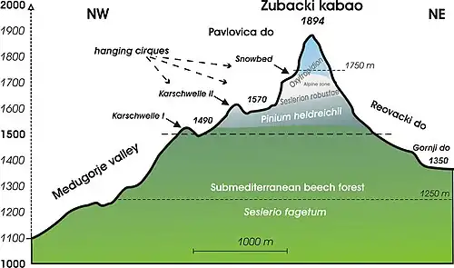 subalpin | 1450–1700 | An der Waldgrenze Rotbuche, Schlangenhaut-Kiefer und Griechischer Ahorn. Darüber trockene Wacholderheiden sowie mit vielen endemischen Arten (z. B. Orjen-Schwertlilie, Dinarische Akelei Viola chelmea) bestandenen Sesleria-robusta-Rasengesellschaften geprägt. Auf grobblockigen Geröllen und Felsen Strauchgesellschaften mit chasmophytischen Kalkfelsspalten-Arten (z. B. Berg-Bohnenkraut, Braunstieliger Streifenfarn, Neumayer-Krugfrucht (Amphoricarpos neumayerianus)). |