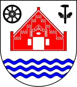 Blasonierung: „In Silber über drei blauen Wellenbalken die rote Front eines Bauernhauses, begleitet rechts oben von einem schwarzen Wagenrad und links oben von einem schwarzen Hammer mit zwei am Stiel ausschlagenden Eicheln.“[4]