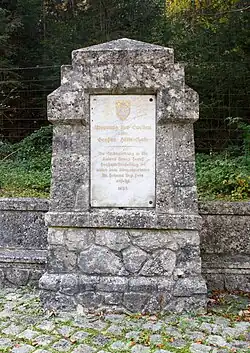 Nächst der Höllental Straße (B27) befindet sich ein Inschriftpfeiler. Er trägt das Wiener Wappen und die Inschrift: