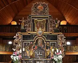 Das Innere der Kirche ist überwiegend im Barockstil gestaltet. Der hölzerne barocke Altar mit Renaissance-Resten aus dem Jahr 1693 stammt noch aus dem Vorgängerbau und hat sechs gemalte Tafeln mit dem Zentralbild Christi Verklärung, Darstellungen der Dreifaltigkeit und Auferstehung Christi im Aufbau, des Letzten Abendmahls in der Predella und seitlich zwei Apostel. An den Seiten befinden sich vier Plastiken: zwei größere der Apostel Petrus und Paulus sowie darüber zwei kleinere von Mose und Aaron.