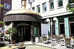 Die Hövels Hausbrauerei ist nicht nur eine traditionelle Dortmunder Brauerei, sondern zugleich auch ein bekannter Gastronomiebetrieb. Das Brauhaus liegt am Dortmunder Wall, nur wenige Minuten von der Innenstadt entfernt im Gebäude der Thier-Galerie.[51] Die Hövels Hausbrauerei verfügt über einen Schankraum, ein Geheimratszimmer, die Hövels-Stube, das Küferzimmer und einen Biergarten. Im Jahr 2018 wird die Gastronomie mit Gasträumen und Biergarten um einen Pavillon im Außenbereich erweitert.[52] Hövels Original findet sich in ausgewählten Rezepten als Bestandteil der Speisekarte wieder.[53][54][55]