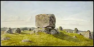 - ↑ Langdysse ist die in Dänemark gebräuchliche Bezeichnung für Dolmen, die in einem rechteckigen oder trapezoiden Hünenbett liegen, im Gegensatz dazu sind Runddolmen bzw. Runddysser jene Dolmen, die im Rundhügel liegen