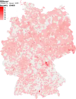 Hübner ist vor allem in Süddeutschland verbreitet, jedoch auch im Rest Deutschlands vorzufinden. Gemeinsam mit der großen Huber-Familie besetzt Hübner Platz 42 der Rangliste der häufigsten Familiennamen in Deutschland. (Siehe auch: Liste der häufigsten Familiennamen in Deutschland).
