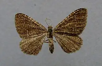 Die Flügelspannweite der Falter beträgt 20 bis 23 Millimeter. Die Grundfarbe der Vorderflügel variiert von rotbraun bis zu graubraun. Auf den Vorderflügeln befinden sich mehrere weißliche, wellige Querlinien, die sich zuweilen nur schwach abheben. Die das Mittelfeld begrenzenden Linien treten stärker hervor. Am äußersten Rand des Saumes verläuft meist ein sehr dünner schwarzer, unterbrochener Streifen. Auf den Hinterflügeln sind mehrere helle Wellenlinien erkennbar. Diskalflecke fehlen.
