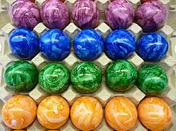 Die Farbe des Dotters wird weitgehend durch das Futter bestimmt. Mais und Grünfutter führen durch die enthaltenen Carotinoide zu einem dunkleren Dotter. Der Farbton des Dotters wird in der gewerbsmäßigen Hühnerhaltung durch Futtermittelzusätze stabil gehalten. Dem Hühnerfutter werden hierzu Paprikapulver oder durch Extraktion gewonnene natürliche Carotinoide wie beispielsweise Lutein oder, wo erlaubt, überwiegend synthetisierte Carotinoide[38] wie beispielsweise Canthaxanthin[39] zugesetzt. Die von den Verbrauchern bevorzugte Dotterfarbe ist regional unterschiedlich und weist ein Nord-Süd-Gefälle in Europa auf. In nördlichen Staaten sind Eier mit gelb gefärbten Dottern beliebter, während in südlicheren Staaten gold-orange gefärbte Dotter bevorzugt werden. Auch in Deutschland ist dieses Gefälle im durchschnittlichen Verbraucherwunsch von gelben Dottern im Norden zu gold-orangen Dottern im Süden vorhanden. Die Dotterfarbe bei Bio-Eiern ist heller als bei konventionell erzeugten Eiern, da der Zusatz von Farbstoffen zum Legehennenfutter im Biolandbau prinzipiell verboten ist.[40][41]
