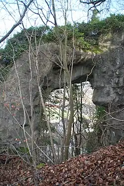 Der Name umschreibt das Aussehen des Felsens: Der natürliche Bogen aus Kalkstein ist ca. fünf bis sieben Meter hoch und erscheint wie eine Pforte für einen Hünen. Um die Hünenpforte ranken sich viele Sagen,[1] Mythen und Geschichten, die sich um Riesen und Raubritter drehen.